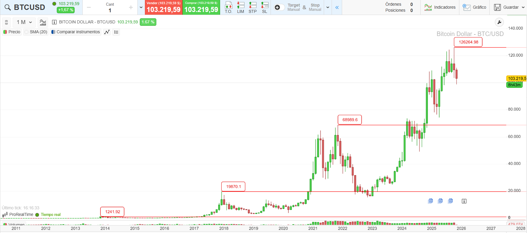 Tras alcanzar los 68 990 $ en noviembre de 2021, el bitcoin vivió un 2022 especialmente adverso. La cotización se hundió hasta los 15 481 $ en noviembre, antes de empezar a recuperarse gradualmente. En marzo de 2024 superó los 70 000 $ y en octubre de 2025 registró un nuevo máximo histórico intradía cercano a los 126 000 $. Desde ese máximo, el precio ha retrocedido hasta el entorno de los 105 000 $.