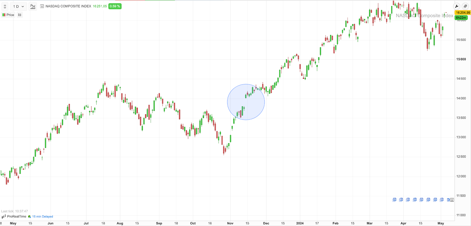Ejemplo de un gap de mercado en el índice NASDAQ Composite analizado a través de la plataforma gratuita ProRealTime Web. Los precios subieron 247 puntos sin que hubiese ninguna operación entre el inicio del gap (13767,74 puntos) y su fin (14015,37 puntos).
