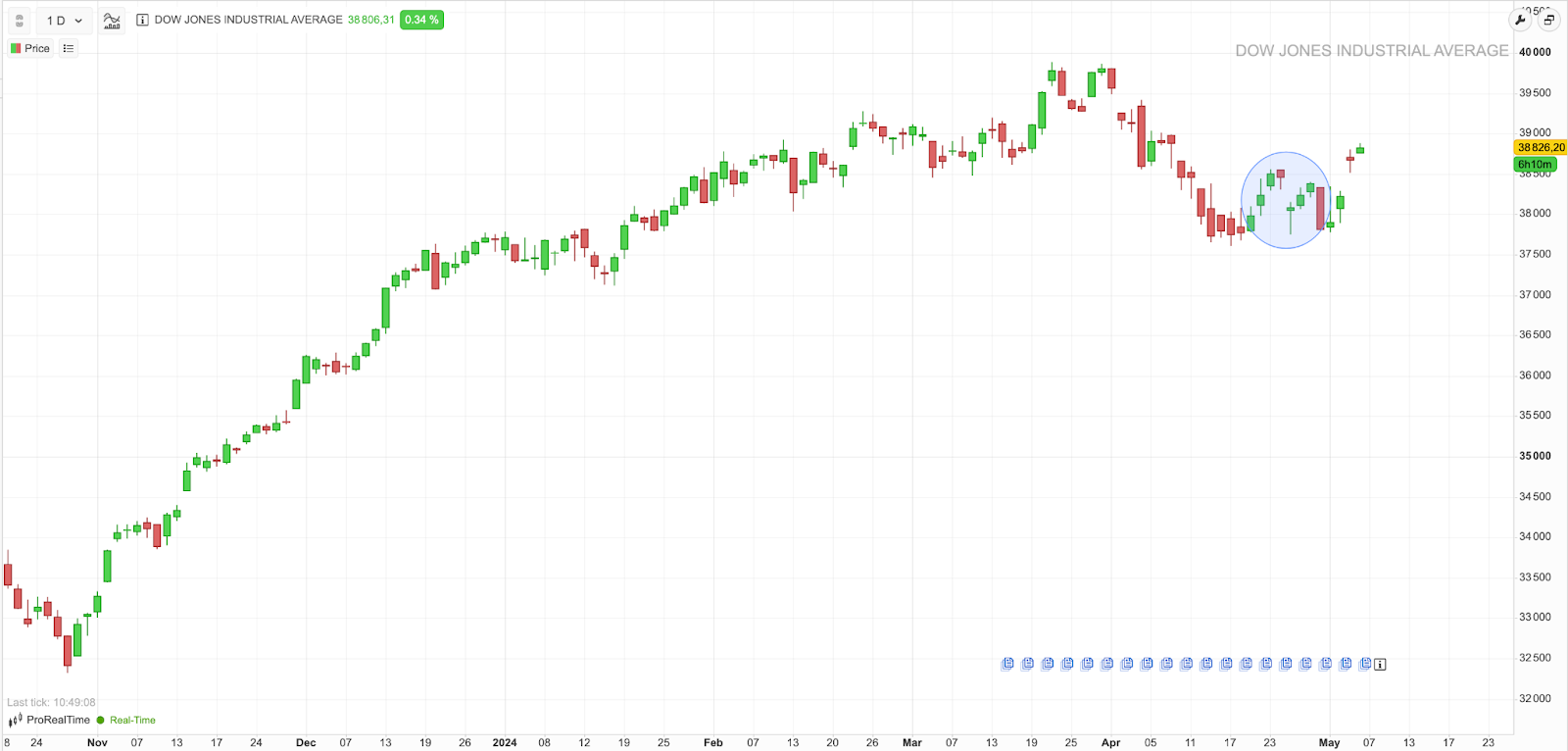 Ejemplo de un gap común en el Dow Jones Industrial Average analizado a través de la plataforma gratuita ProRealTime Web. El mercado rellena rápidamente este gap común bajista.