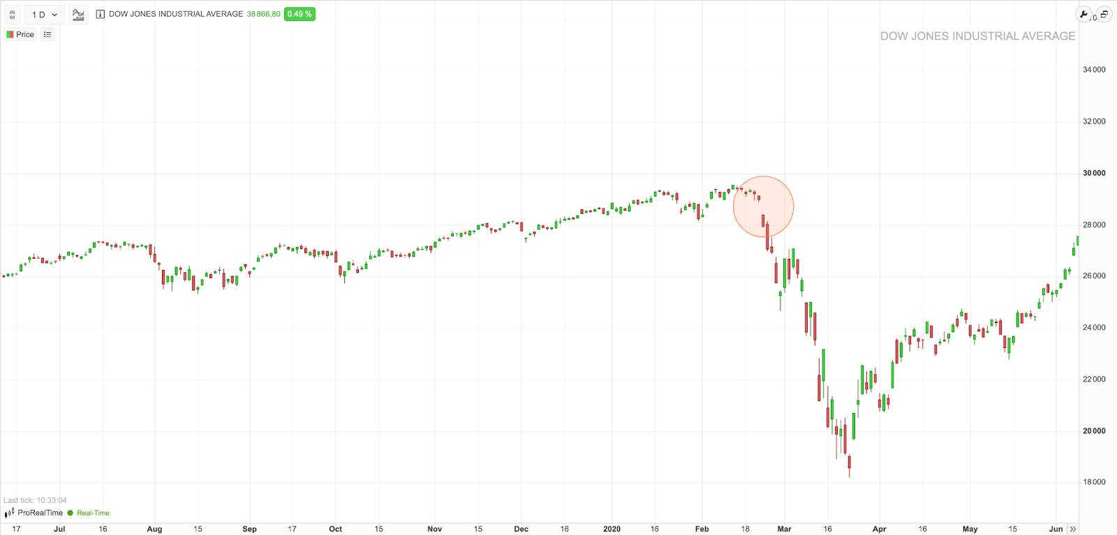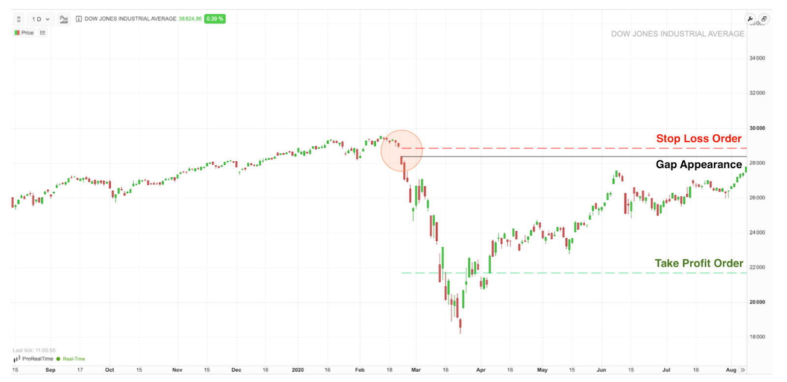 Ejemplo de un gap de ruptura en el Dow Jones Industrial Average analizado a través de la plataforma gratuita ProRealTime Web. Este gap de ruptura bajista marca el inicio de un descenso del 37,1 %.