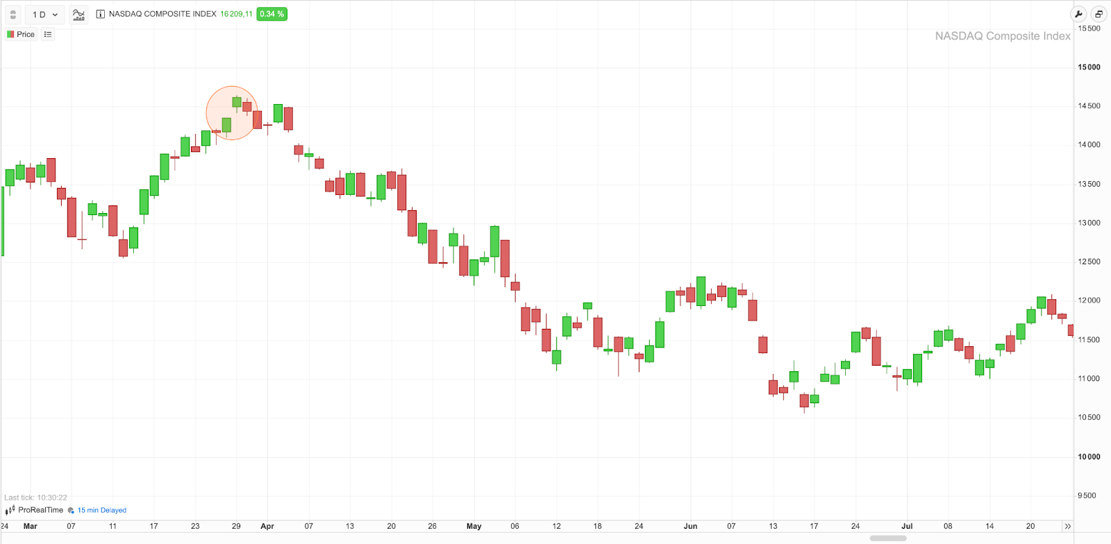 Ejemplo de un gap de agotamiento en el índice NASDAQ Composite analizado a través de la plataforma gratuita ProRealTime Web. Este gap de agotamiento marca el fin de la tendencia alcista y el inicio de una nueva tendencia bajista.