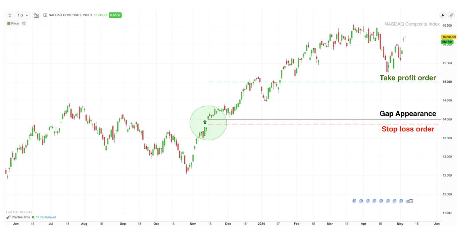 Ejemplo de una posición larga tras la aparición de una gap de continuación en el índice NASDAQ Composite analizado a través de la plataforma gratuita ProRealTime Web. El trader abre una posición cuando aparece el gap (línea negra), coloca su orden de stop de pérdidas por debajo del gap (línea de puntos roja) y una orden de retirada de beneficios por encima (línea de puntos verde).