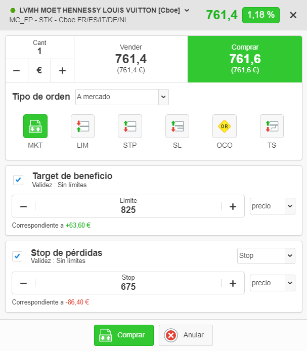 Ticket de orden de la plataforma ProRealTime Web. En este ejemplo, el trader está a punto de comprar una acción de LVMH con una orden de mercado en los 761,6 €. Se añade una orden de take profit en los 825 € y una orden de stop loss en los 675 €.