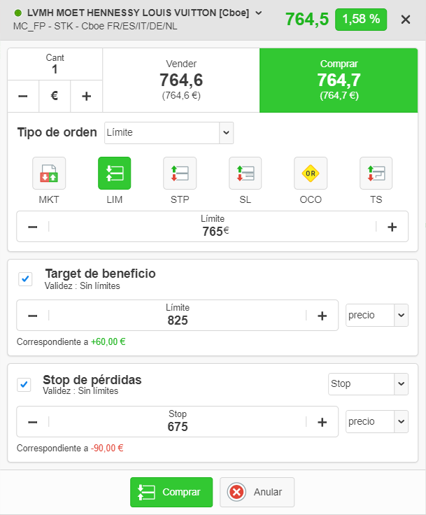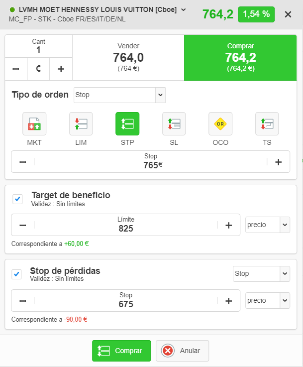 Ticket de orden de la plataforma ProRealTime Web. En este ejemplo, el trader está a punto de comprar una acción de LVMH con una orden de stop en los 765 €. Se añade una orden de take profit en los 825 € y una orden de stop loss en los 675 €.
