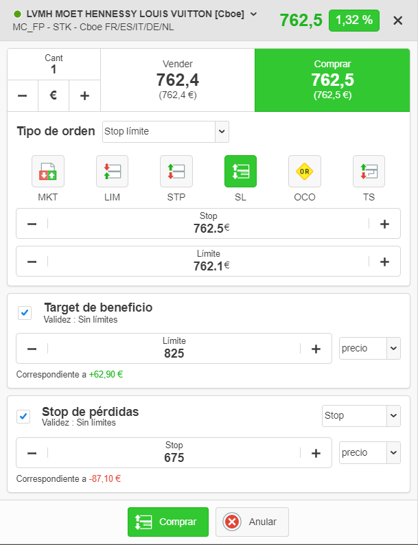 Ticket de orden de la plataforma de ProRealTime Web. En este ejemplo, el trader está a punto de comprar una acción de LVMH con una orden stop límite con un umbral en los 762,5 € y un límite en los 762,1 €. Se añade una orden de take profit en los 825 € y una orden de stop loss en los 675 €.