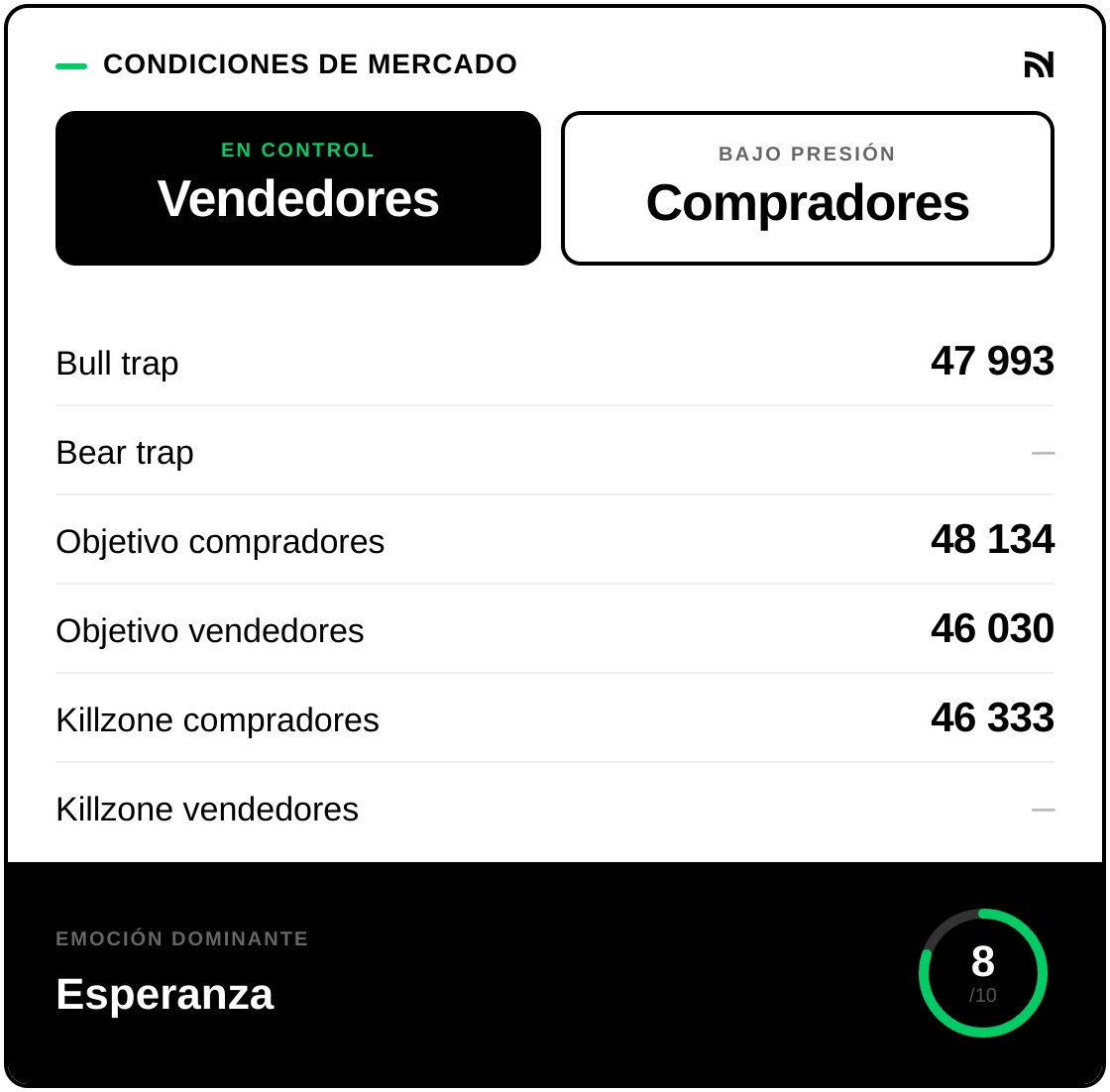 Mientras ese nivel no se conquiste, los bajistas siguen controlando la situación y los compradores se encuentran bajo presión. En este contexto, apuesto por las caídas, con el objetivo de barrer los stop-loss situados en la kill zone de los 46.333 puntos.