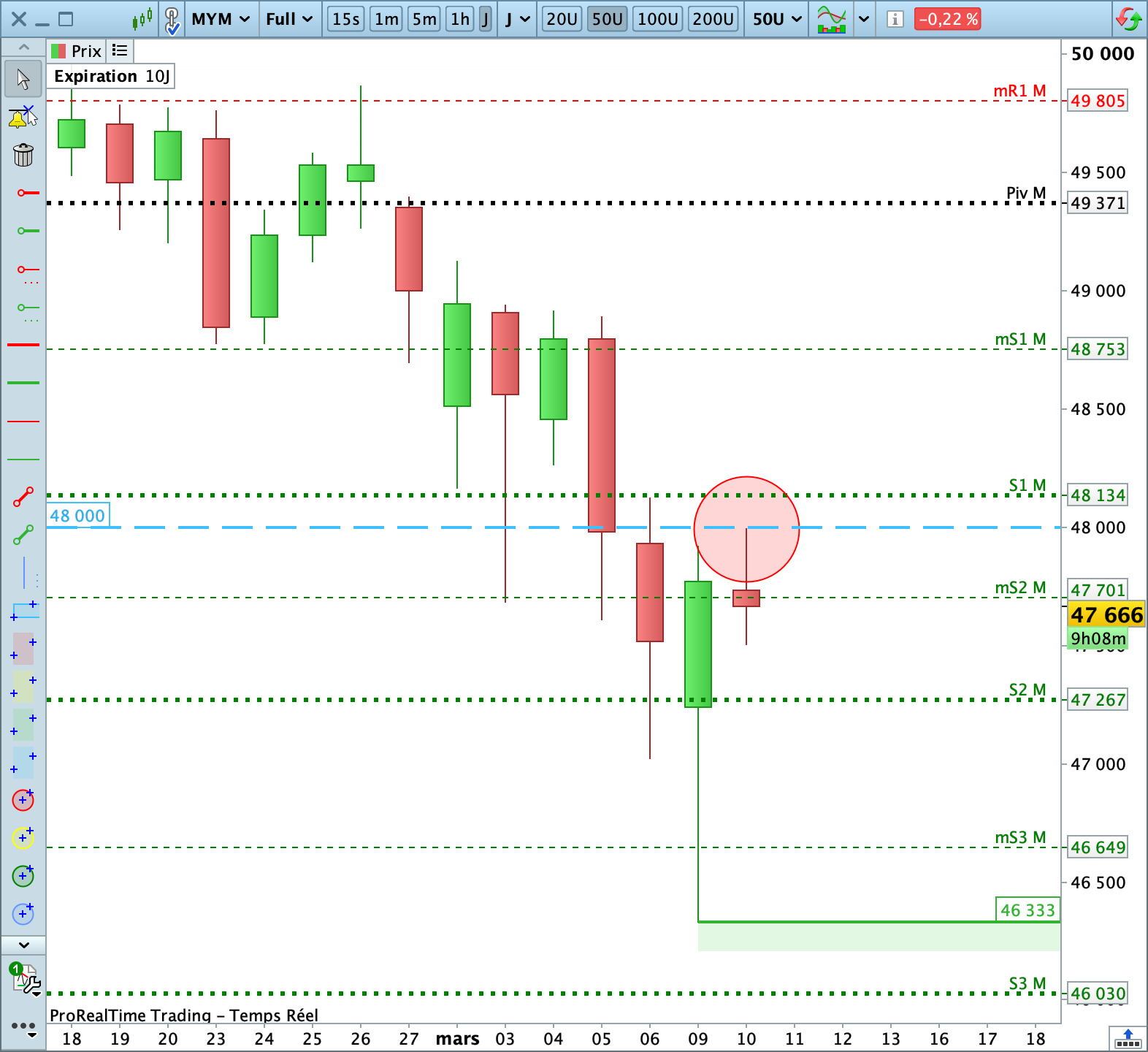 Las declaraciones de Donald Trump permitieron al mercado rebotar un escalón más arriba, pero los compradores no lograron alcanzar su objetivo: el Soporte 1 mensual situado en los 48.134 puntos.