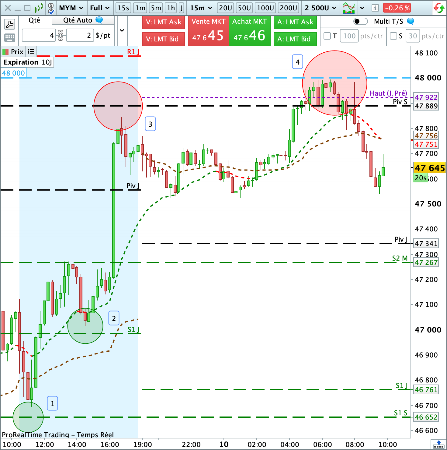 Los compradores, frenados primero por el punto pivote semanal al cierre de la sesión [3], intentaron extender su ofensiva fuera de horario en dirección al umbral simbólico de los 48.000 puntos y al Soporte 1 mensual de los 48.134 puntos, pero no lo consiguieron [4].
