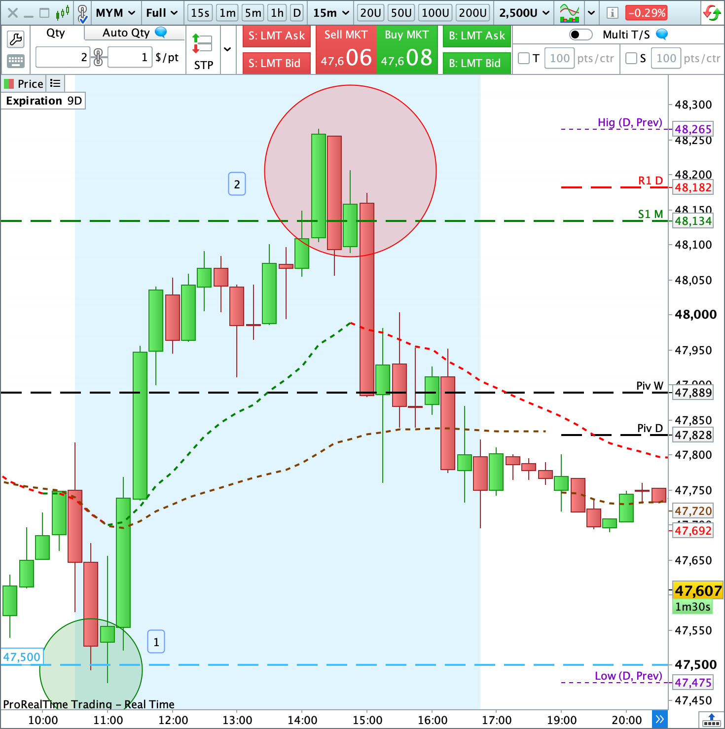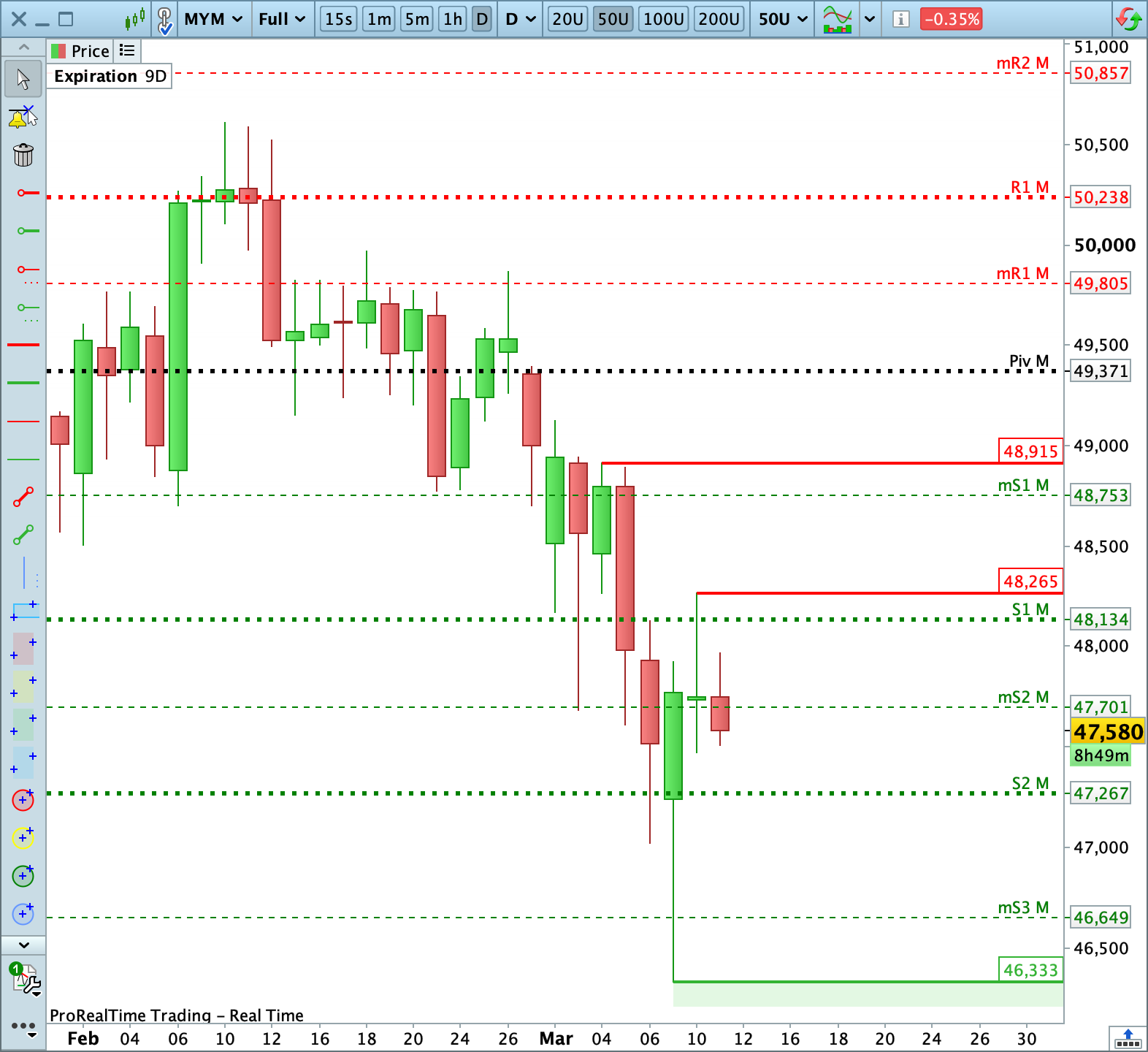 Sin presión vendedora, el mercado continuó su rebote ayer. Pero hasta que se demuestre lo contrario, los bajistas siguen controlando la situación. En este contexto, mantengo mi visión bajista, con el objetivo de ir a la zona de los 46 333 puntos donde se acumulan los stop-loss de los compradores.
