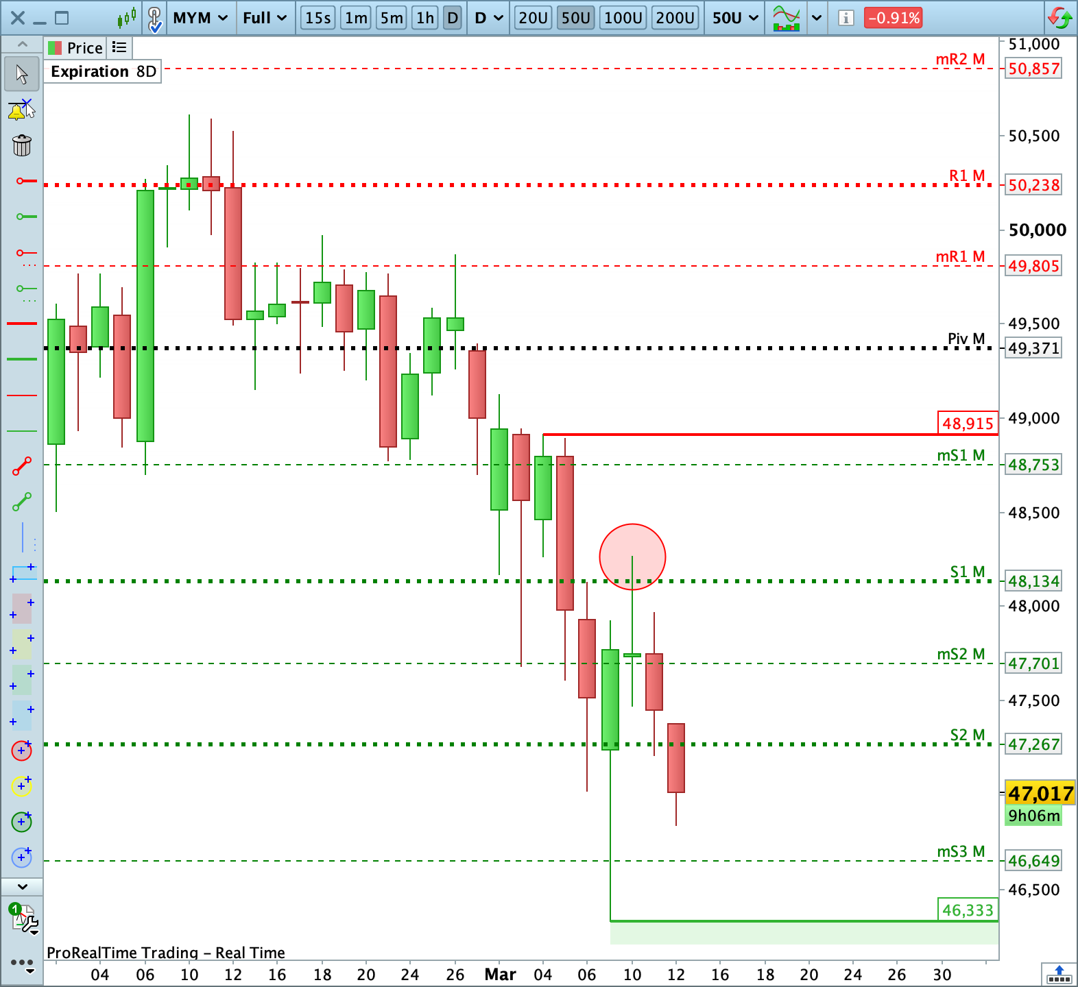 En este contexto, sigo manteniendo una visión bajista con el objetivo de buscar los stop-loss de los alcistas en los 46 333 puntos, y potencialmente el Soporte 3 mensual si la presión vendedora se mantiene a lo largo de la sesión de hoy.