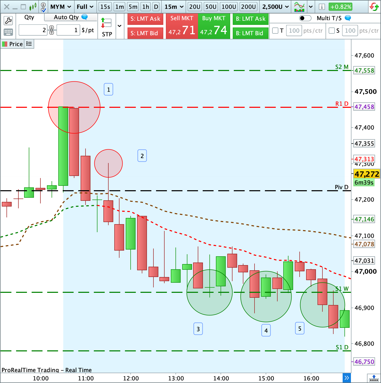 Los compradores intentaron alcanzar el Soporte 2 mensual [1][2] sin conseguirlo. Los bajistas, en cambio, apuntaron al Soporte 1 semanal y dieron en el blanco en todas las ocasiones [3][4][5].