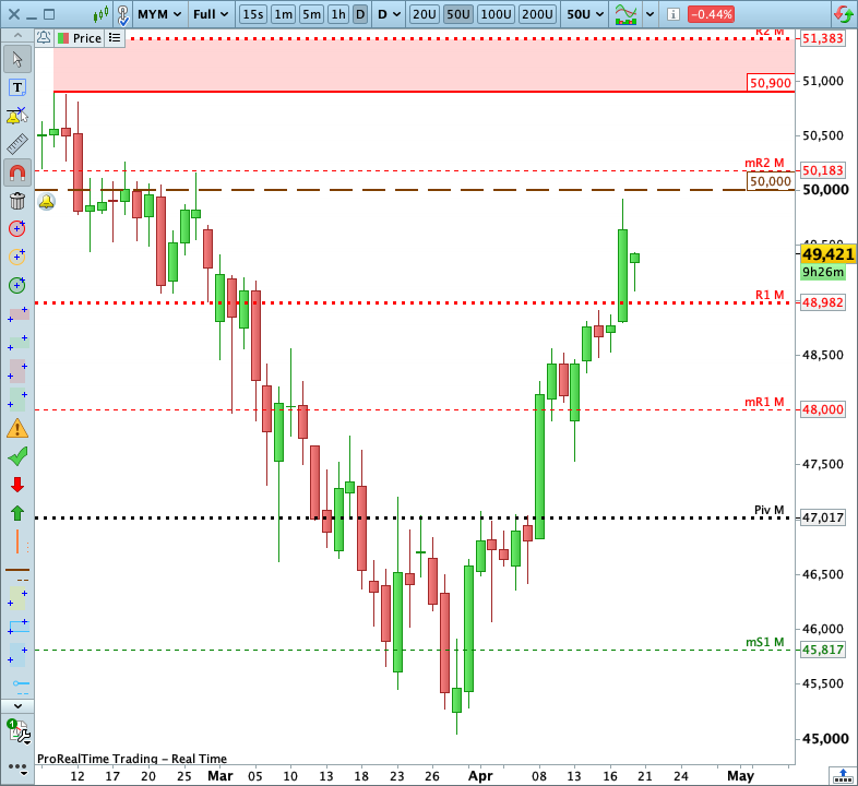 En este contexto, volveré a priorizar las operaciones alcistas con objetivo en el umbral psicológico de los 50 000 puntos (nivel en el que podría iniciarse una corrección).