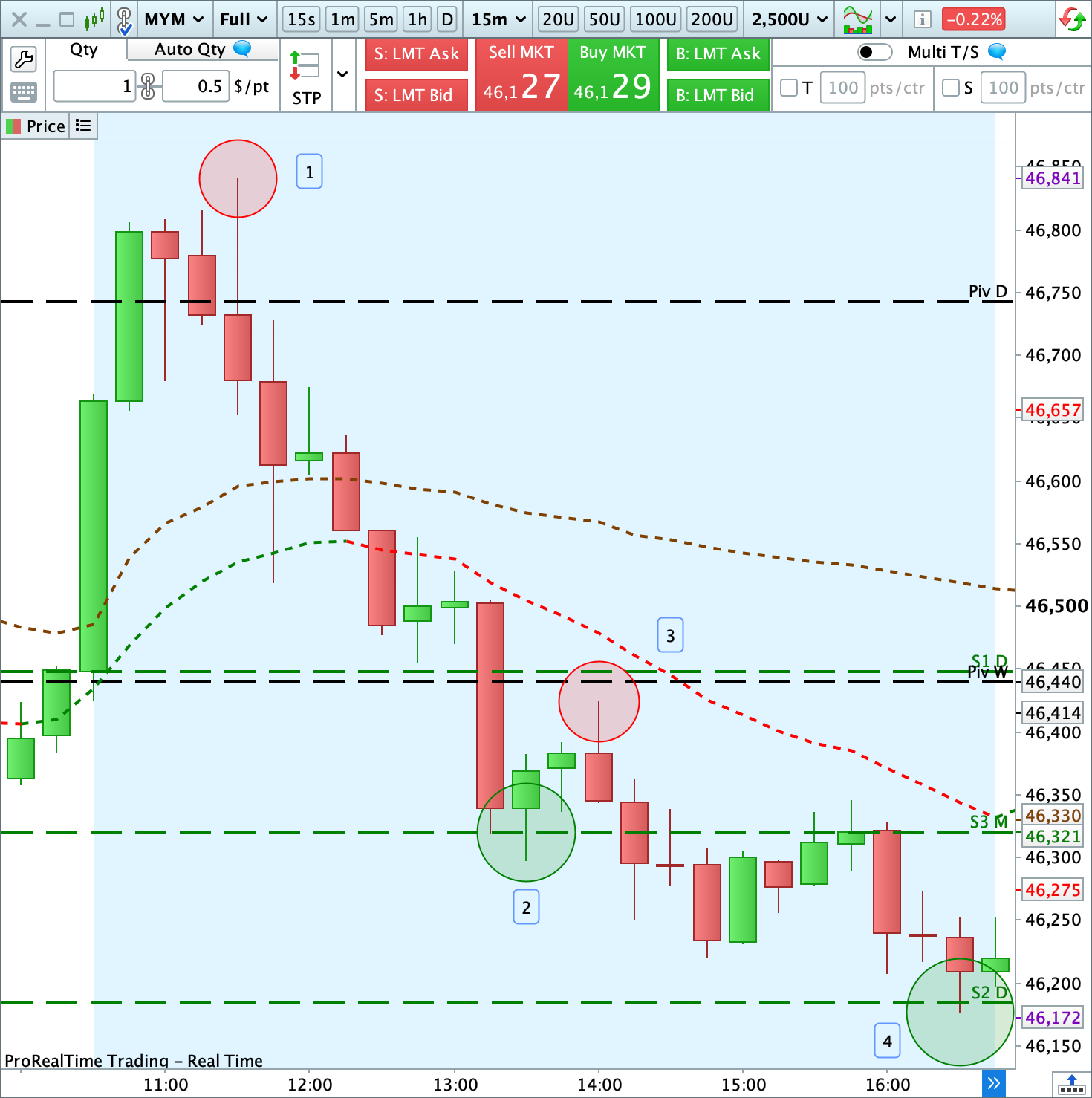 Los compradores intentaron alcanzar el punto pivote semanal sin lograrlo [3], y los vendedores aprovecharon para continuar su ofensiva y alcanzar el objetivo del soporte 2 diario [4].