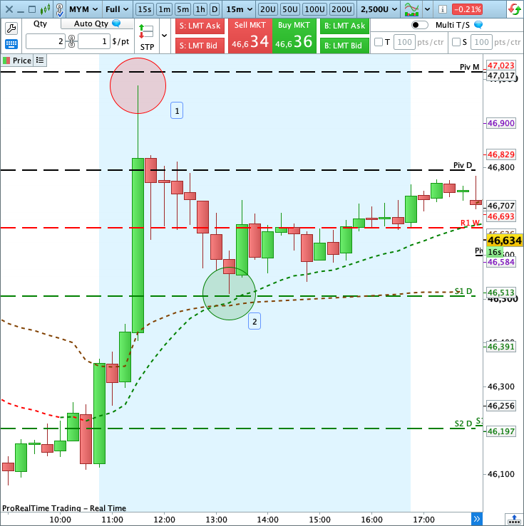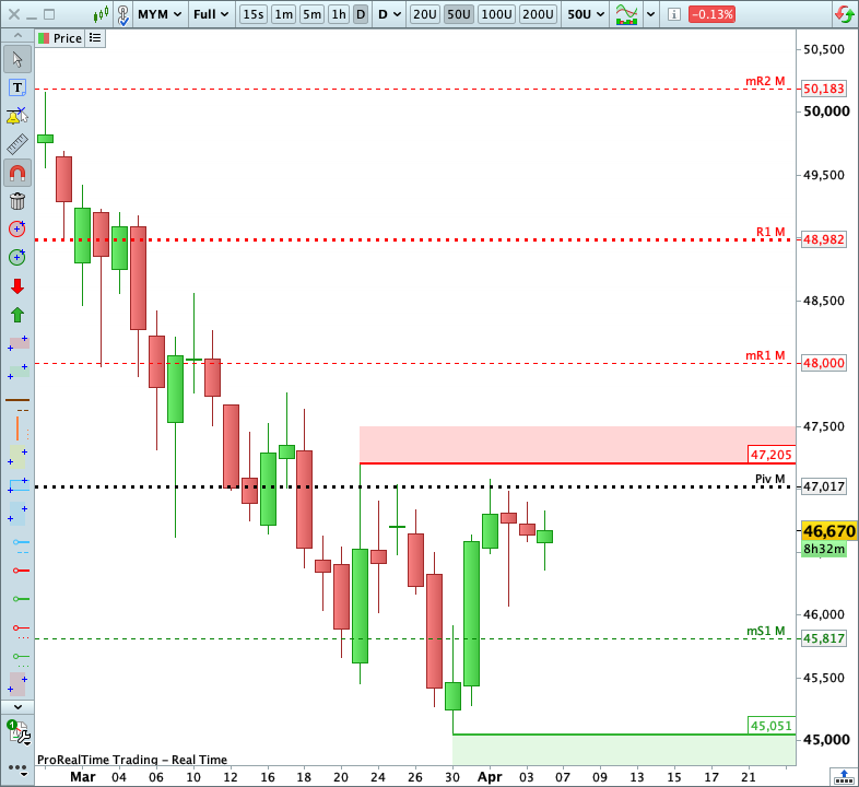 Optimistas en la apertura, los compradores intentaron sin éxito alcanzar el punto pivote mensual [1], pero, a diferencia de los días anteriores, la contraofensiva vendedora hacia el umbral simbólico de los 46 500 tampoco cosechó un mejor resultado [2].